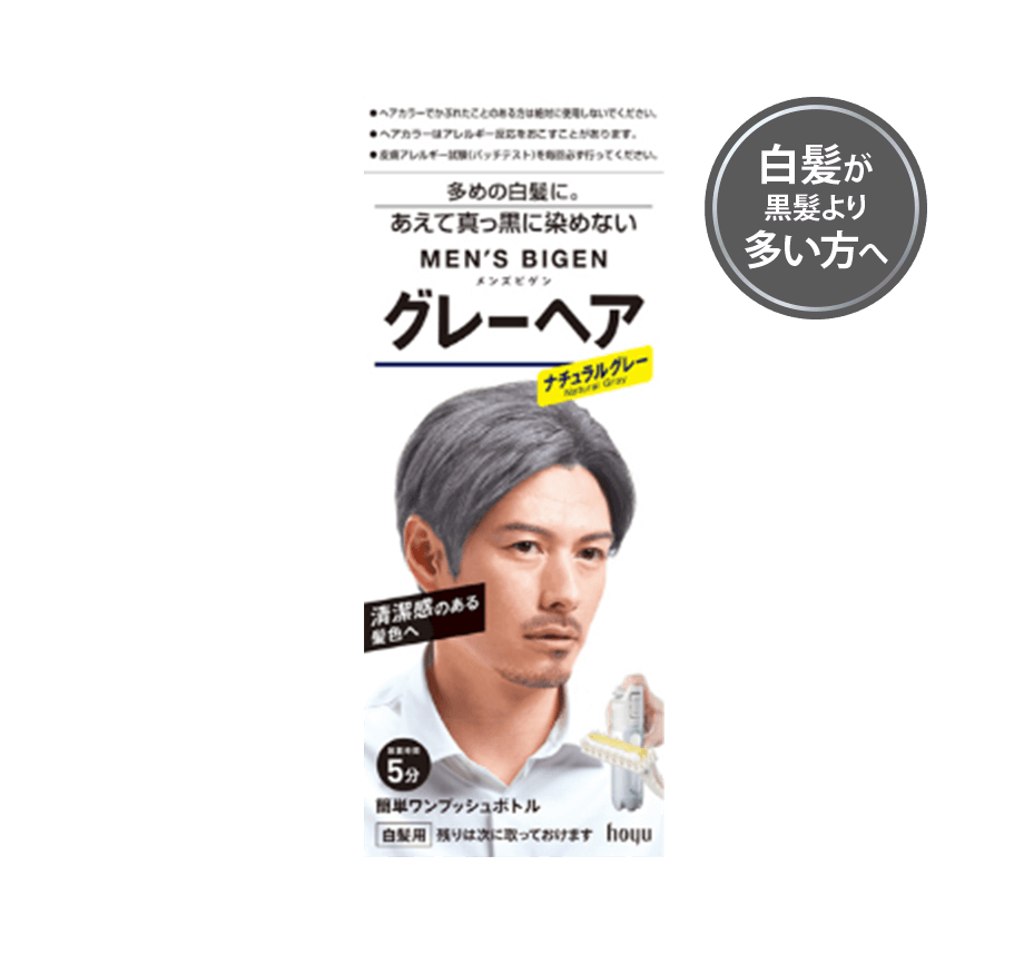 多めの白髪の方へ。あえて真っ黒に染めず清潔感のあるグレーヘアへ。毛髪へのダメージに配慮したトリートメント成分配合。使い方簡単なワンプッシュタイプ。残りが見える「小窓付き」ボトル採用。